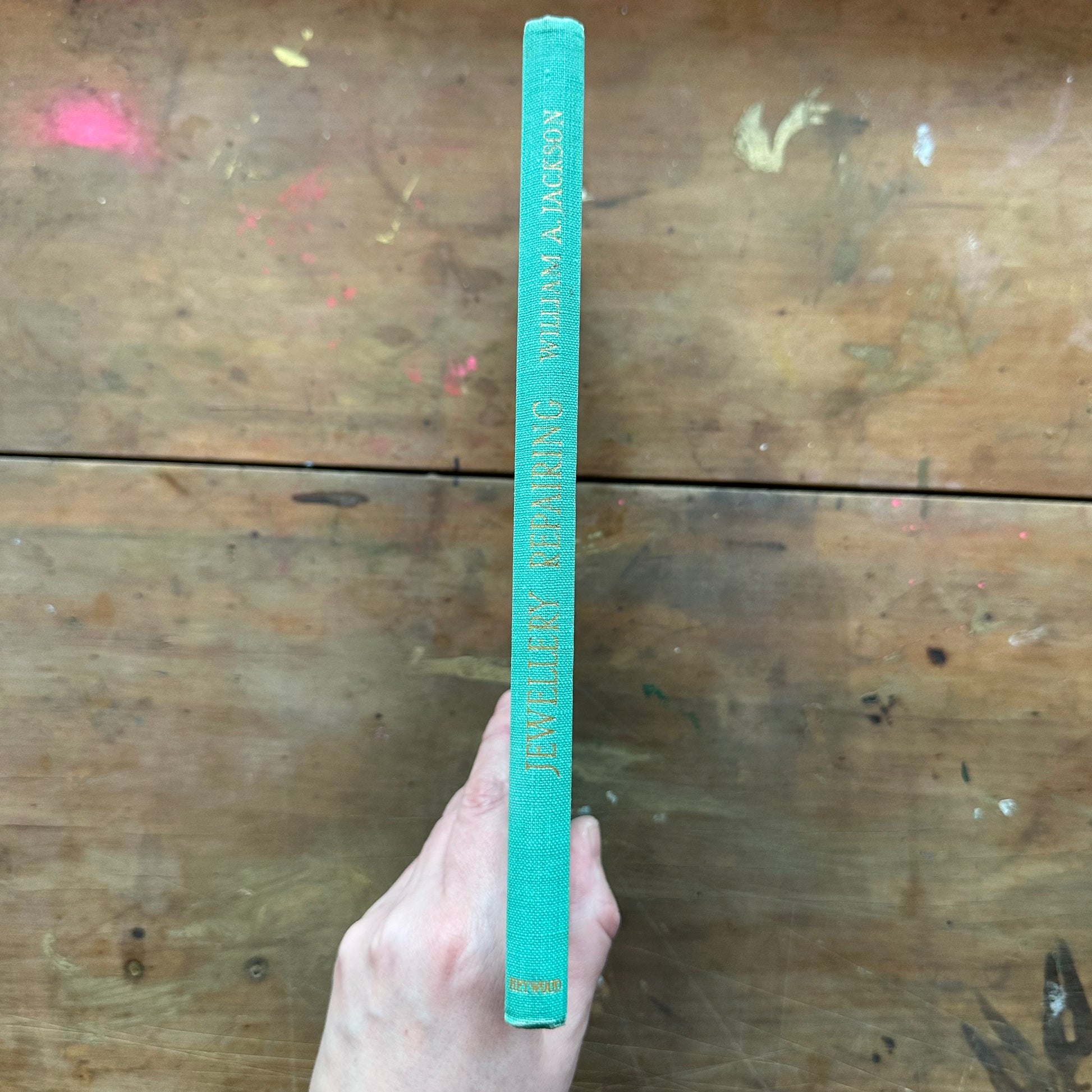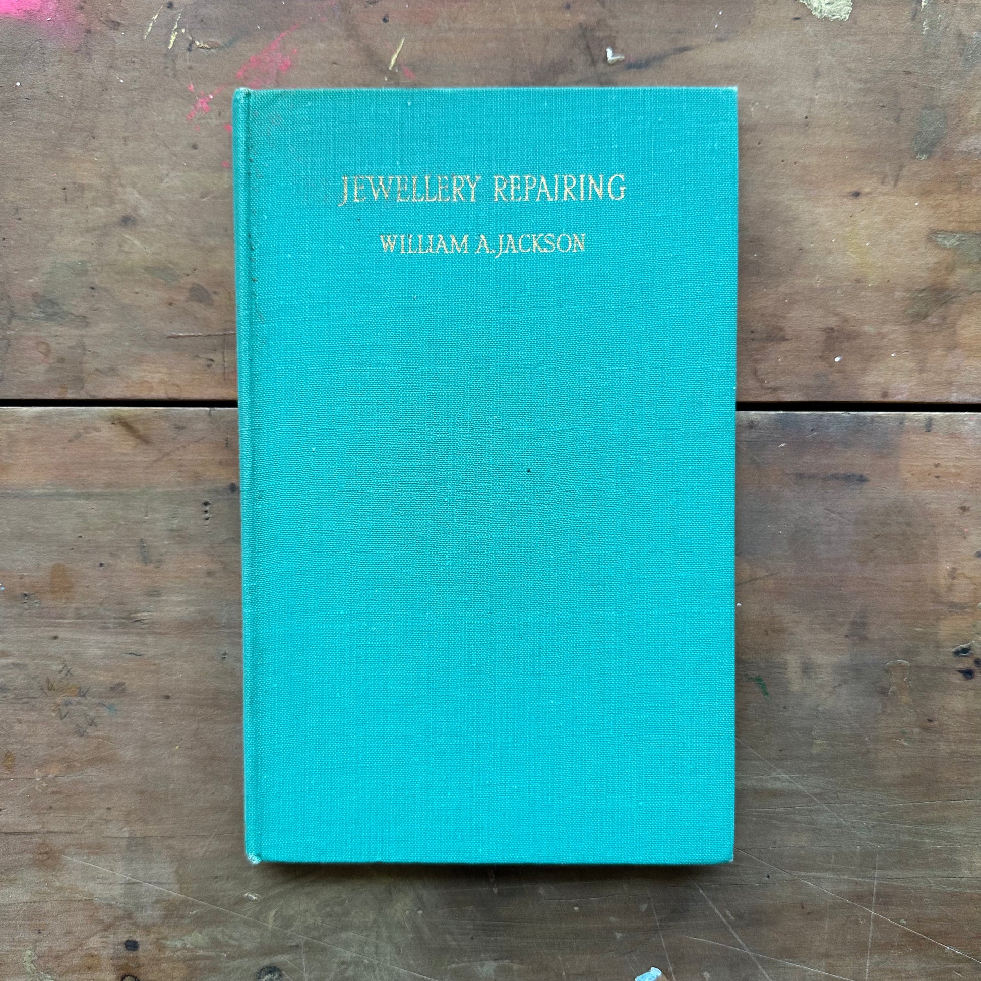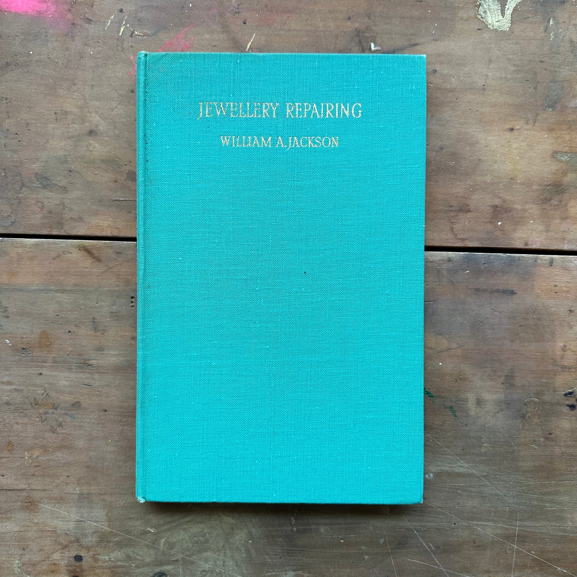 Jewellery Repairing is a hardback book with a worn dust jacket, revealing a beautiful turquoise cloth-bound cover beneath, showing some age-related wear but still very presentable. Despite its age, the technical instructions and repair guidance remain highly relevant and useful.