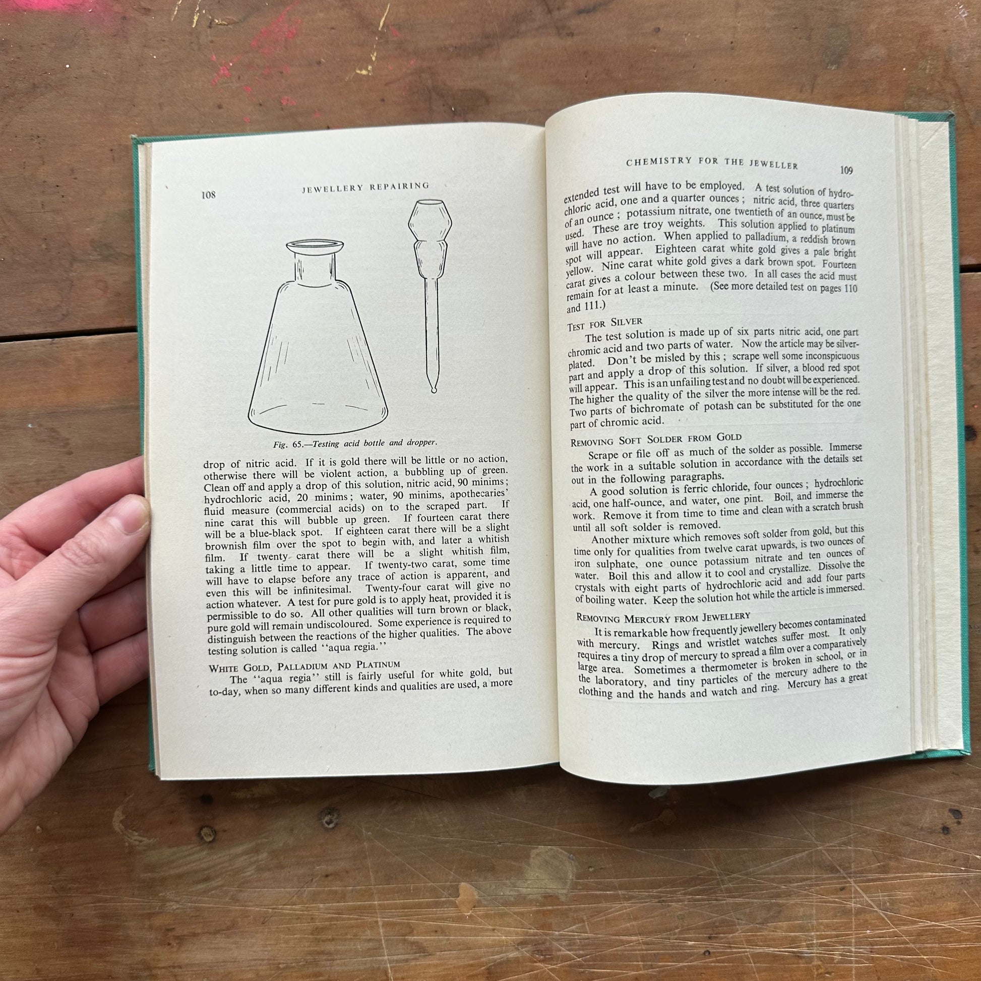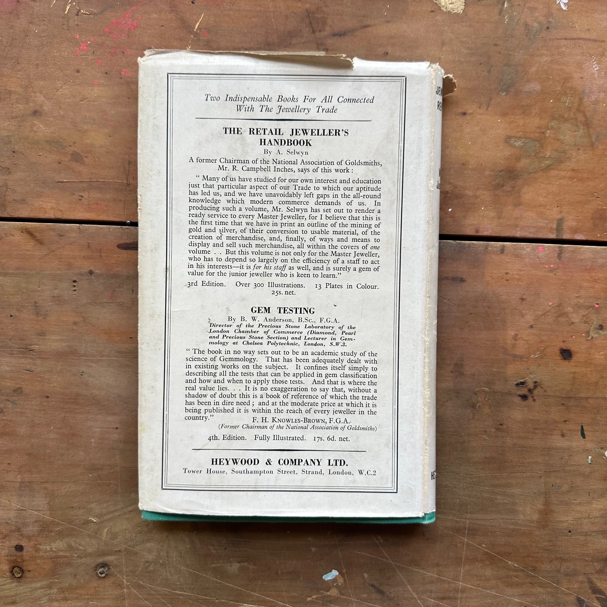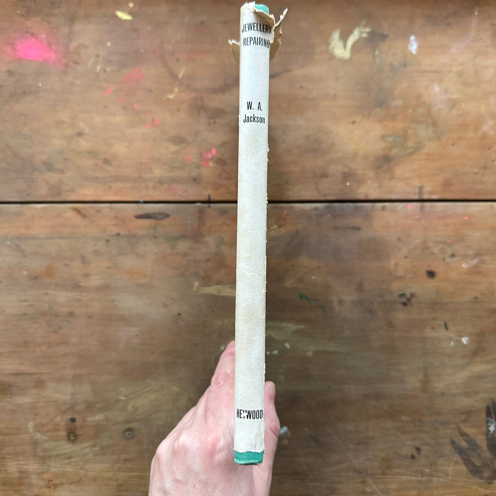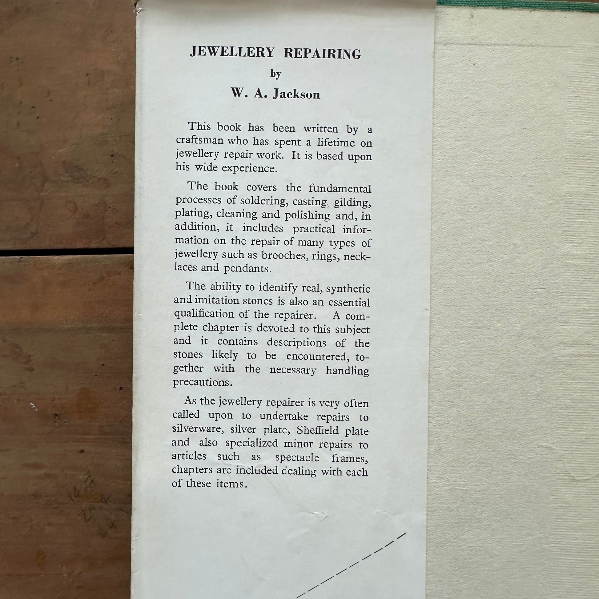 Jewellery Repairing is a hardback book with a worn dust jacket, revealing a beautiful turquoise cloth-bound cover beneath, showing some age-related wear but still very presentable. Despite its age, the technical instructions and repair guidance remain highly relevant and useful.